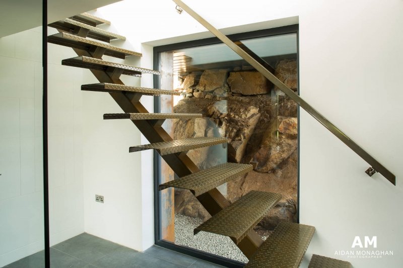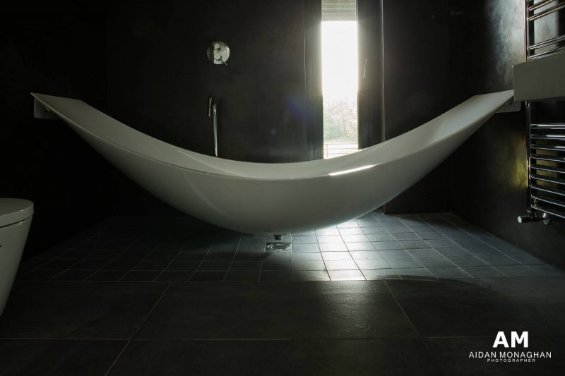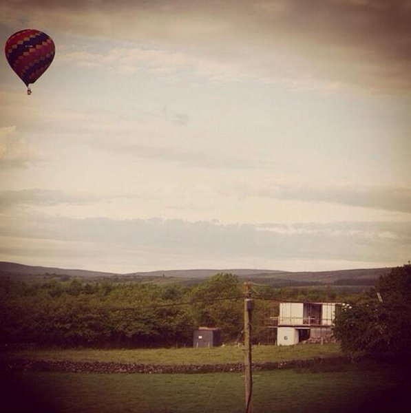 The Grillagh Water Container House blends modern comfort with rural charm. The upper floor contains an open-plan kitchen, dining, and living area, all flowing freely into one another. Balcony areas provide breathtaking views of the landscape. On the lower floor, the master bedroom, utility room, and bathroom offer a peaceful retreat. The bathroom features a suspended hammock-style bath, while the master suite has incredible views of Drumlamph Woodland.