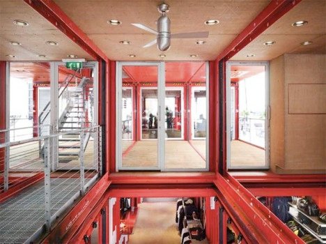 The building uses 40-foot long shipping containers as well as a number of the existing container connectors to join and secure containers both horizontally and vertically. Each module is designed to ship as conventional cargo container through a system of structural covering panels that fully seals all of its large openings to be removed on site to re-connect the large, open interior spaces.