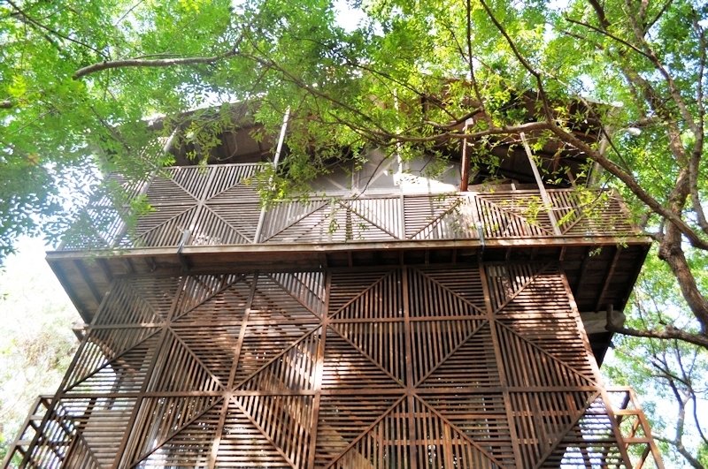 The teak used throughout the upper levels is treated using a natural mix of linseed oil, vinegar, and engine oil, offering protection against termites and monsoon moisture. Aluminum roof panels reflect sunlight, reducing heat gain and improving interior comfort.