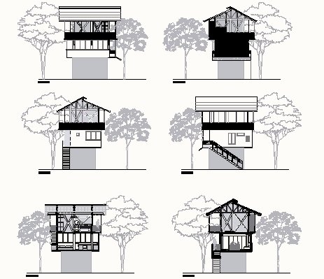 The ground level comprises a brick-built garage. The first floor includes a living area, kitchenette, and bathroom. The topmost level, constructed entirely of seasoned teak wood, contains a bedroom with views of the nearby sea. Sliding glass doors with mosquito-netted frames enhance airflow and allow for 360-degree ventilation, a key requirement in off-grid timber house tropical designs.